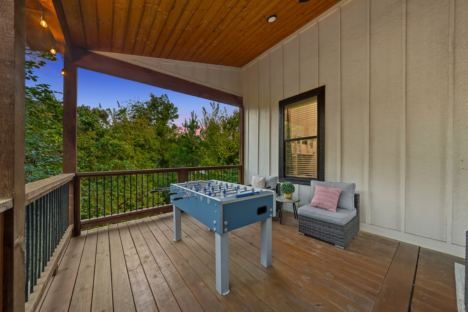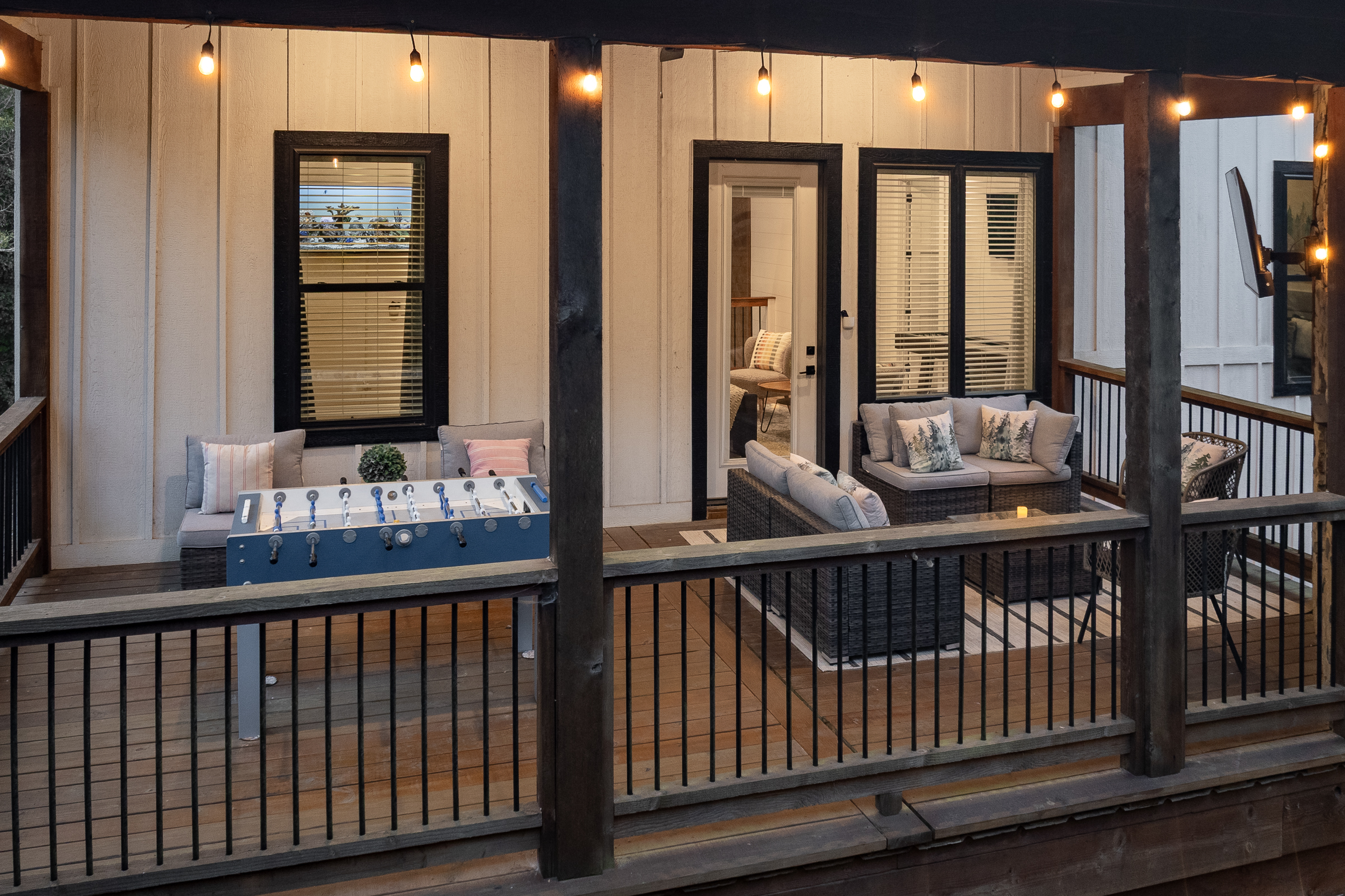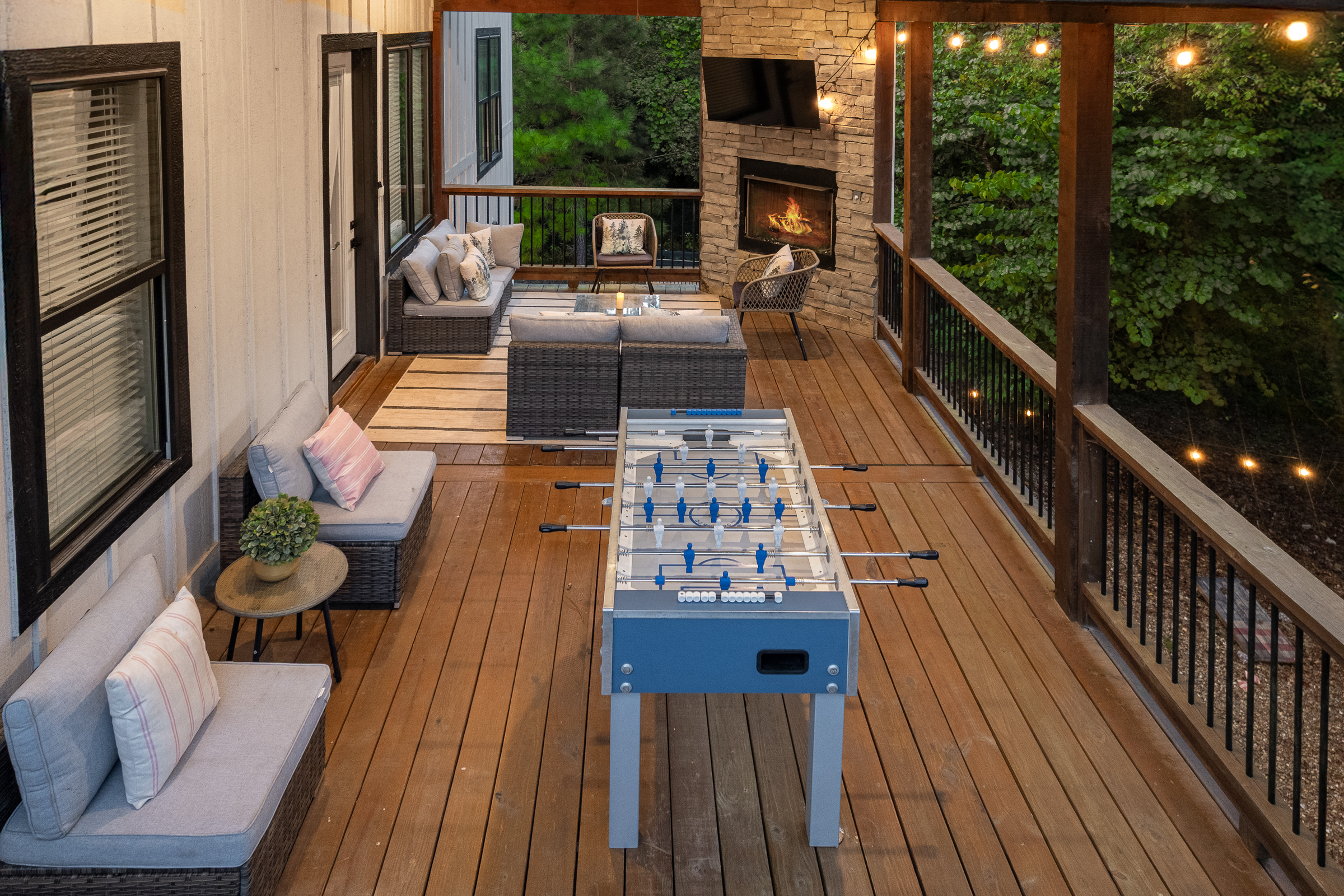 - Upstairs Balcony: Unwind with fireplace seating, Smart TV & foosball while enjoying endless Scenic Views.