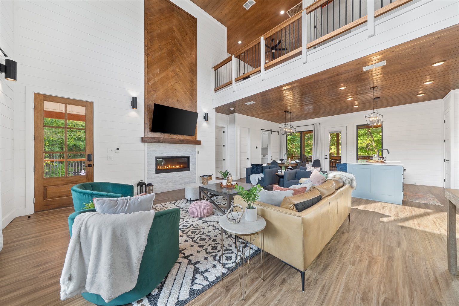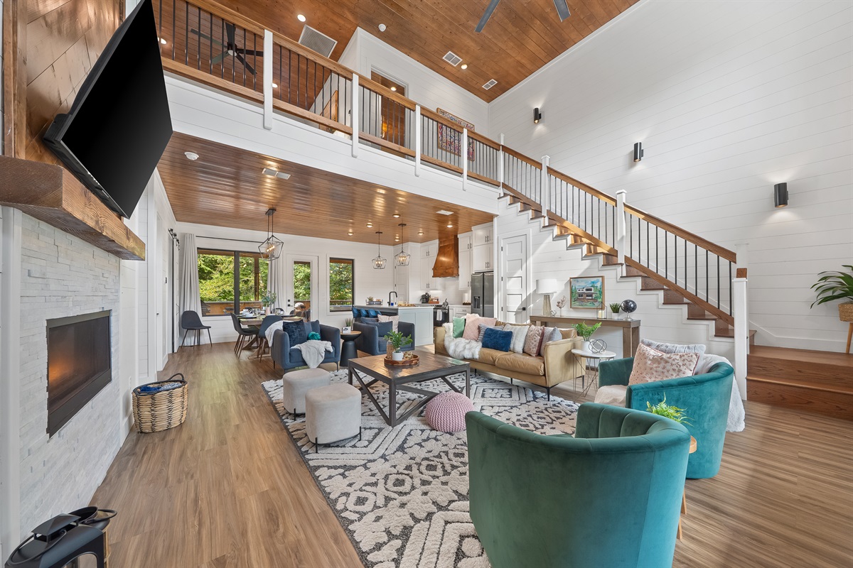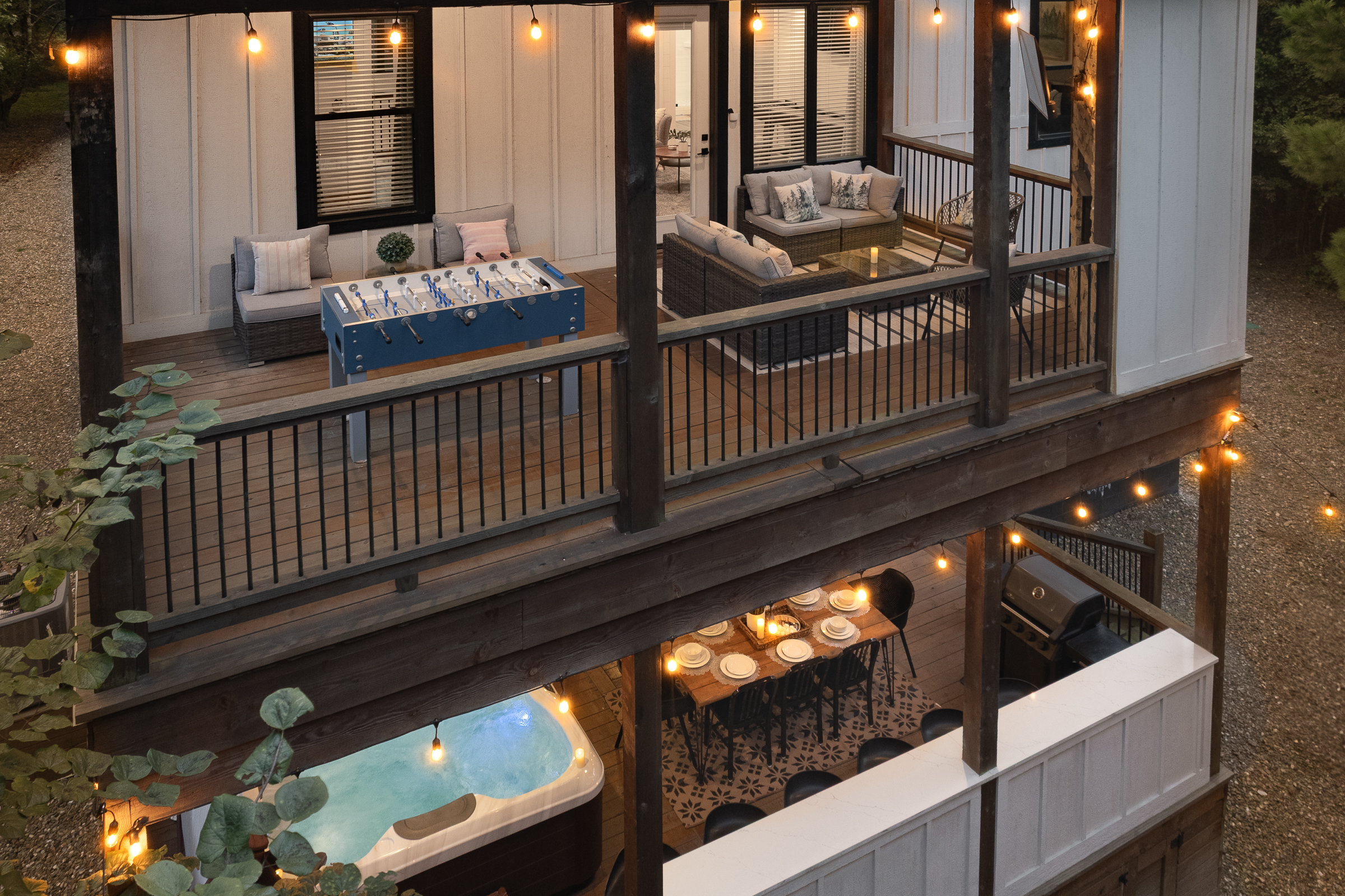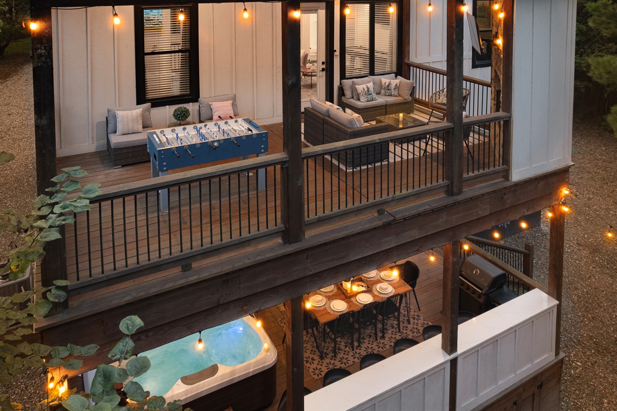 - Upstairs Balcony: Unwind with fireplace seating, Smart TV & foosball while enjoying endless Scenic Views.
