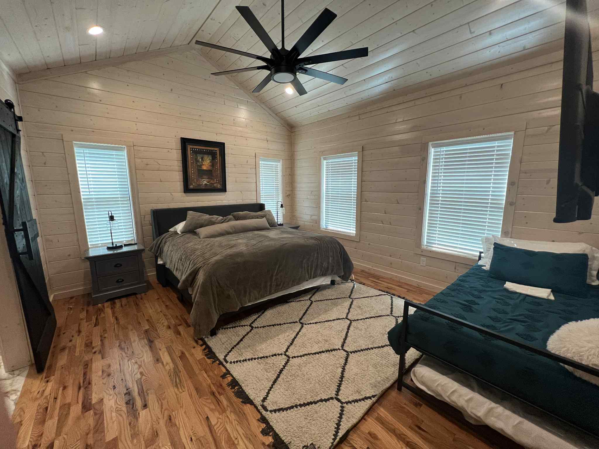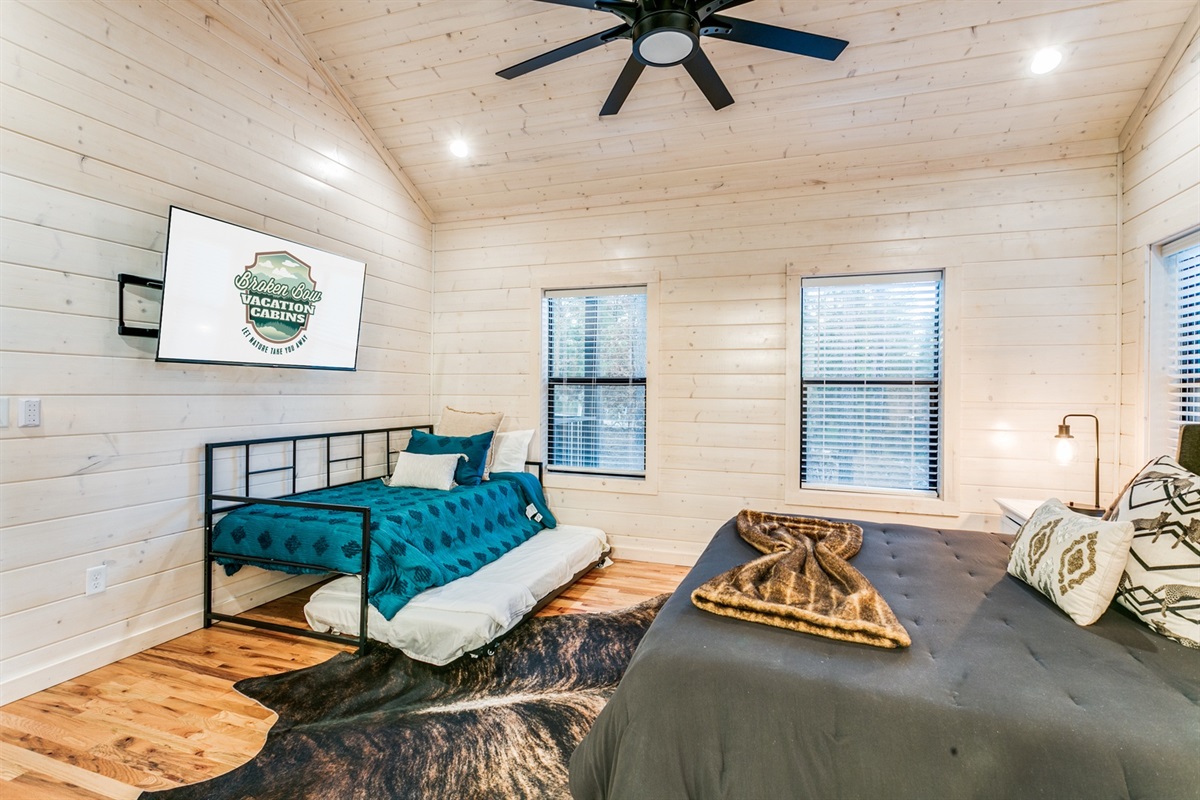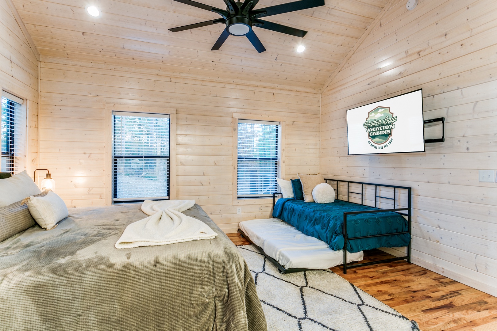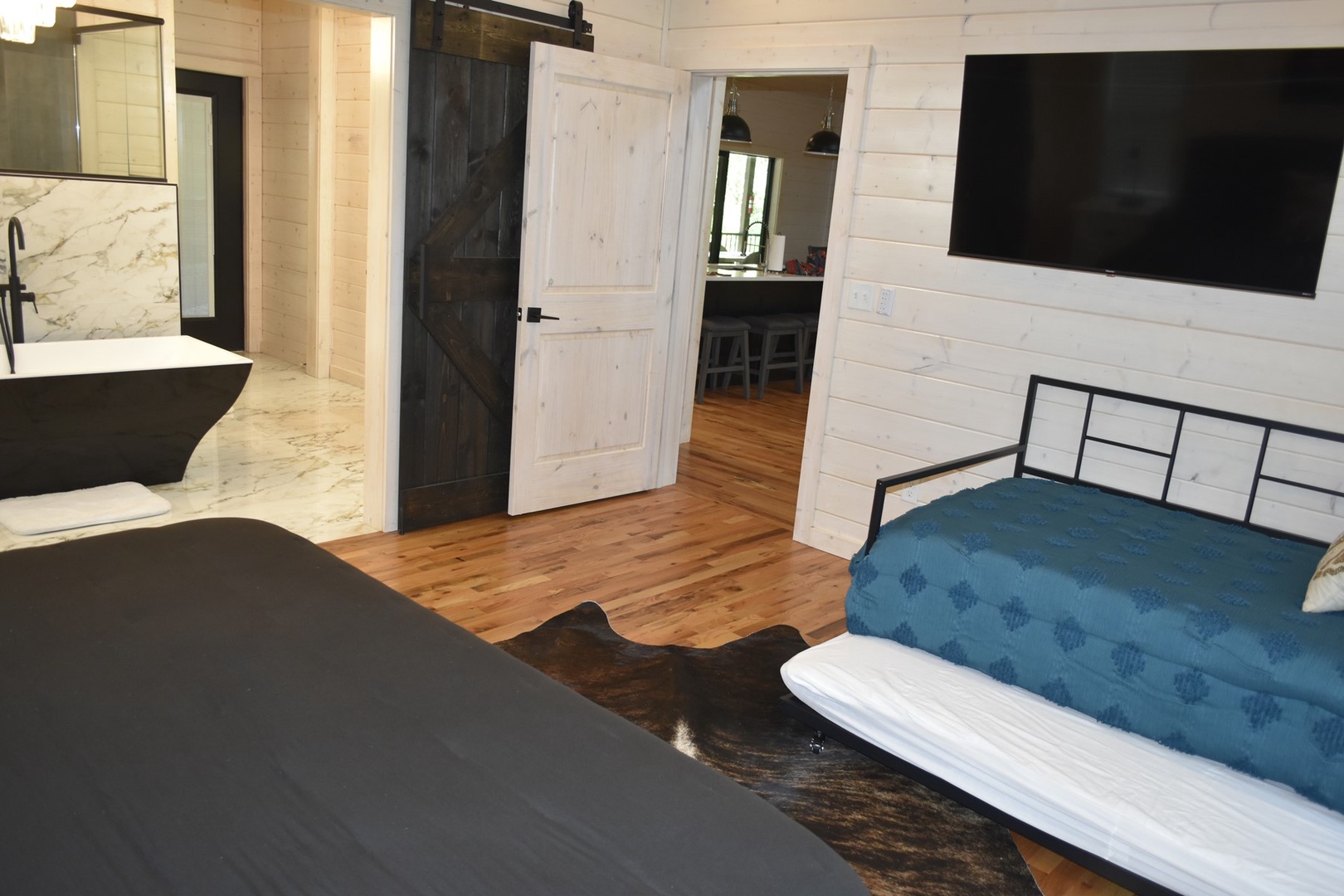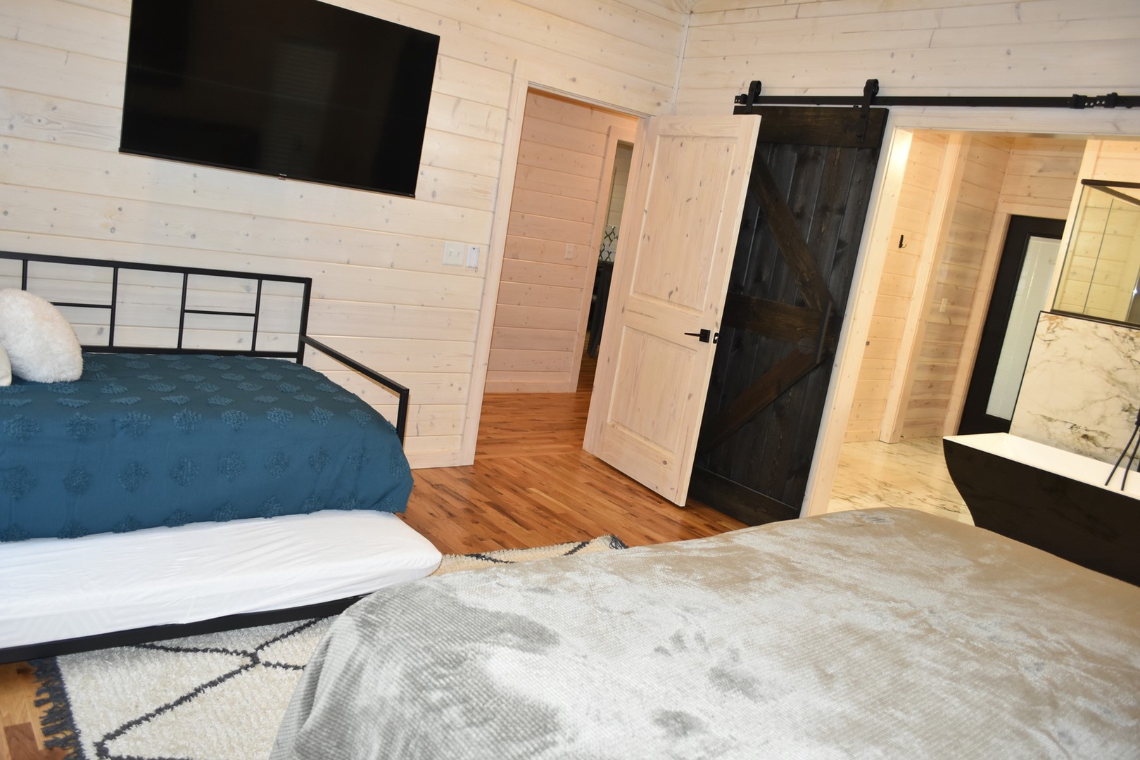 Bedroom 2: King + twin trundle, ensuite with soaking tub, spa shower, 2 vanities, 55” Hisense Roku TV