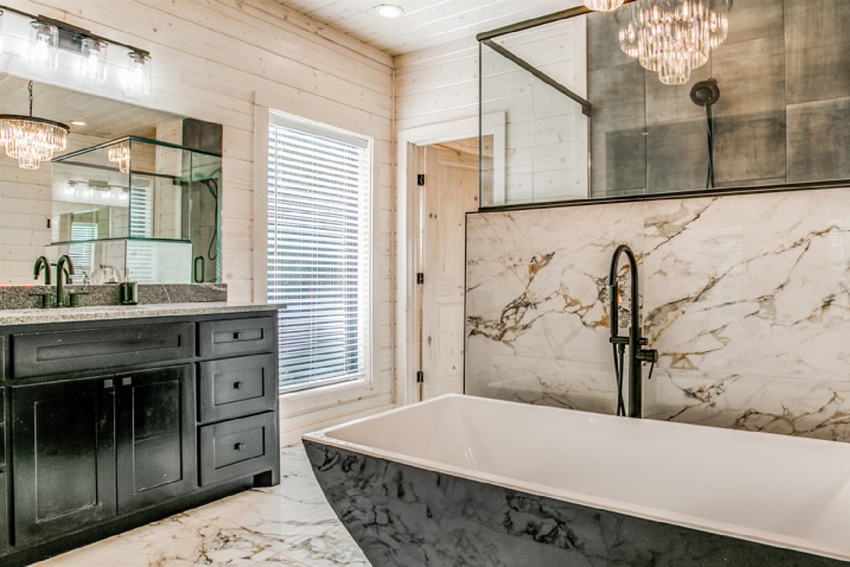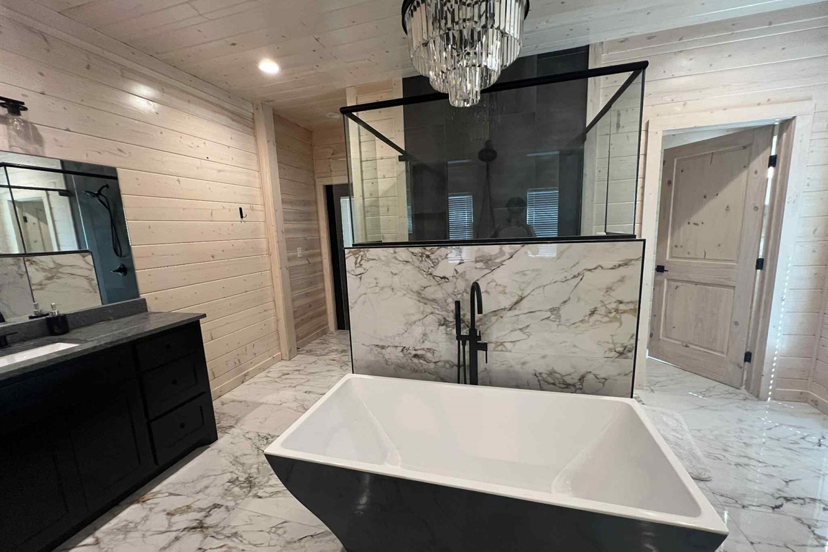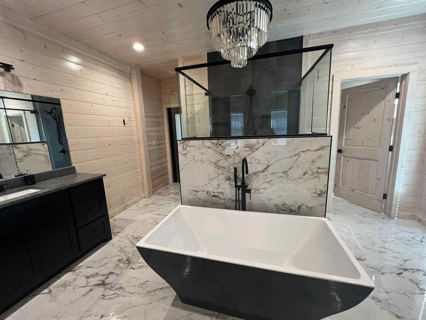 Bedroom 1: King + twin trundle, ensuite with soaking tub, spa shower, 2 vanities, 55” Hisense Roku TV