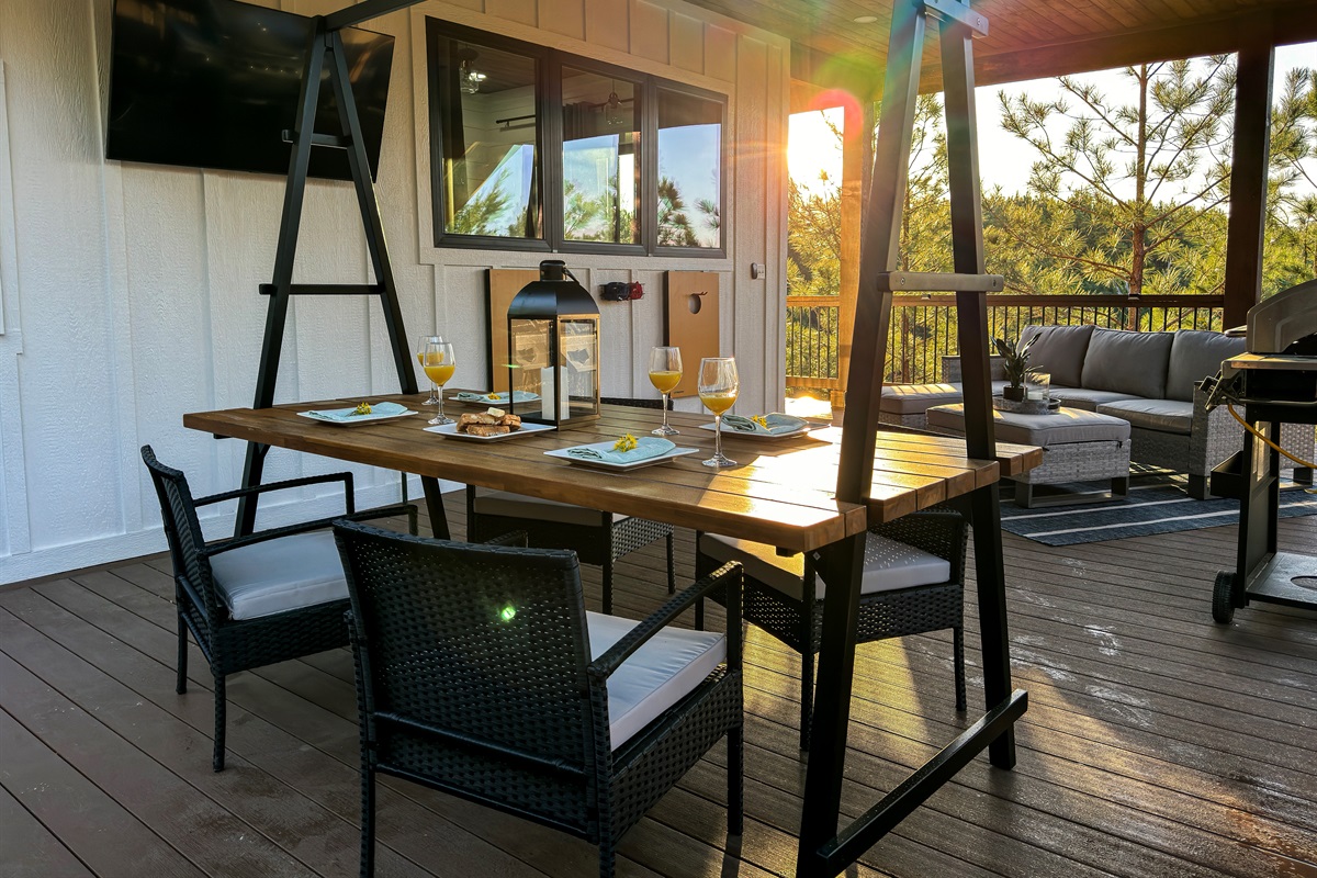 Lower Deck: Seasonal Cocktail pool, Pool Table, Propane grill, Dining table, lounge seating, outdoor TV, and a fire pit surrounded by tall pines.