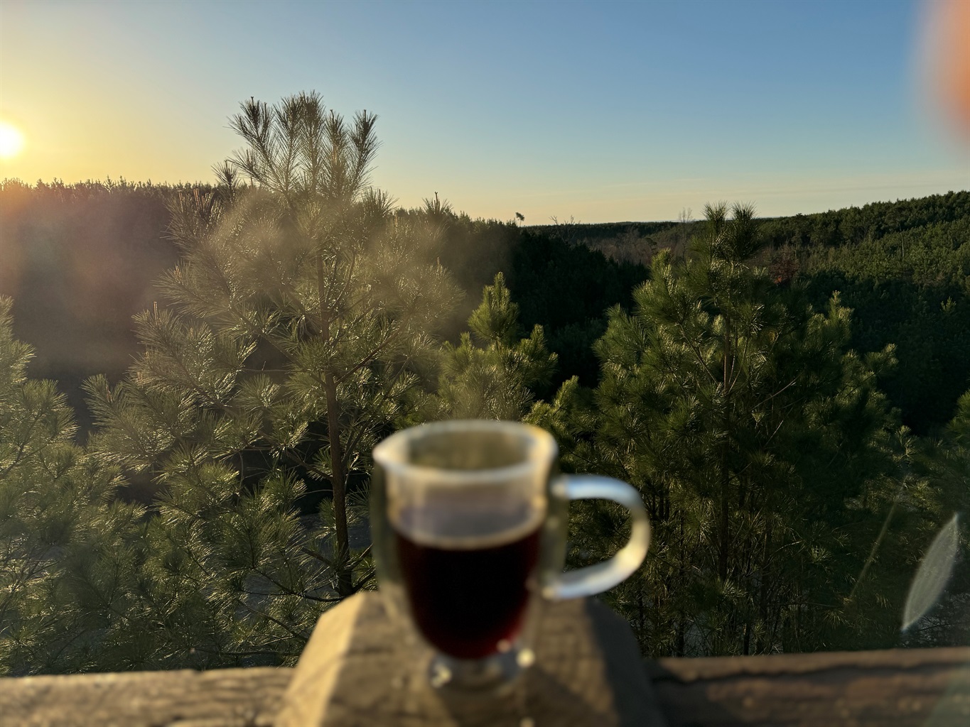 Cozy king bed with privacy curtains, sliding glass doors opening to endless treetop views, and TV. Wake up to sunrise light spilling into the room; guests say it’s unforgettable.