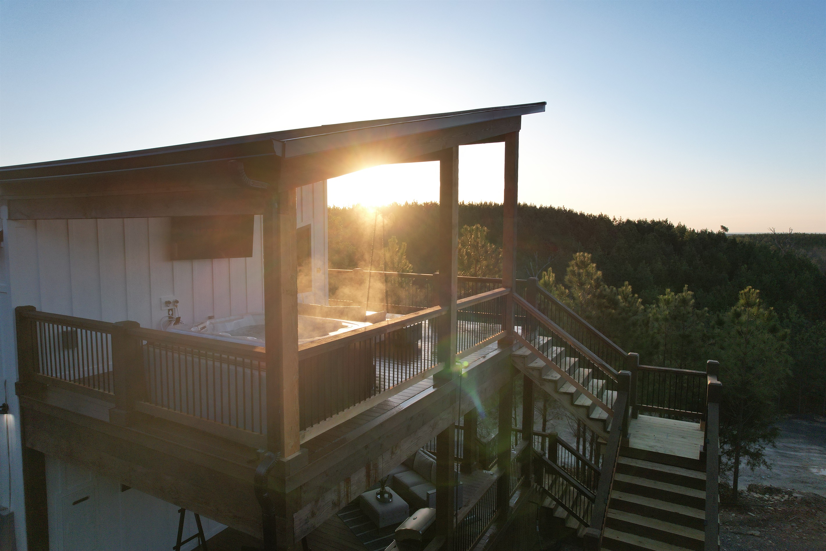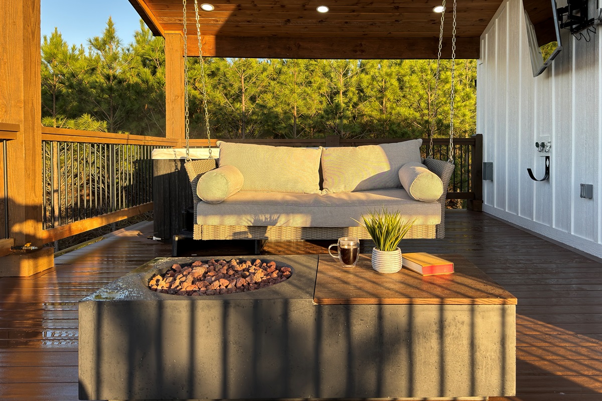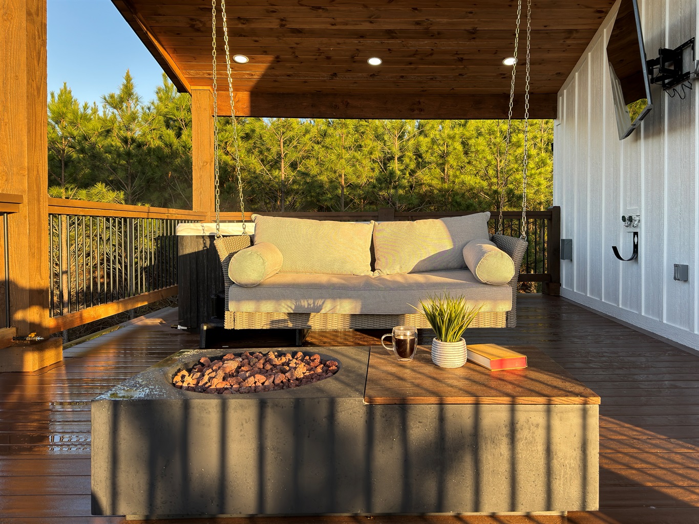Upper Deck: Hot tub under the stars, porch swing, telescope for stargazing, outdoor TV, lounge seating and pool table for late-night fun.