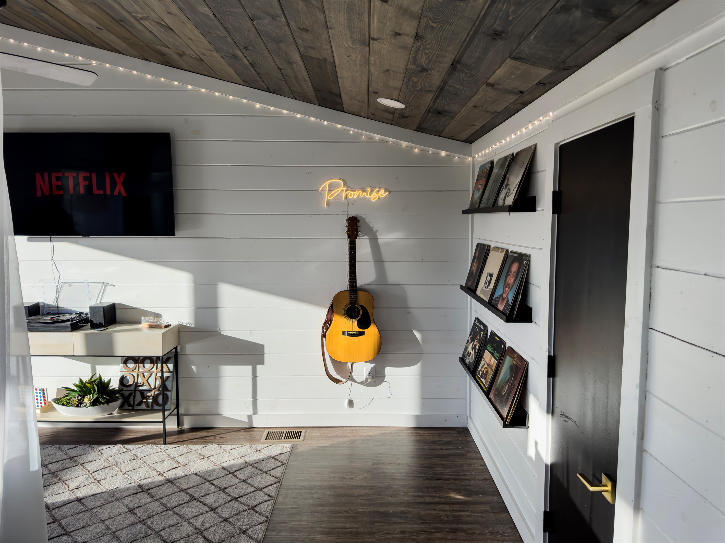Plush daybed with trundle (sleeps 2 extra guests), sheer canopy, record player with vinyls & Bluetooth, guitar, and TV. A favorite for lazy mornings and slow evenings.