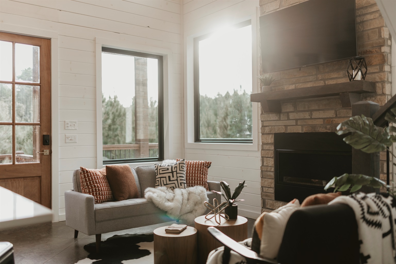 Vaulted ceilings, floor-to-ceiling windows bringing the outside in, fireplace, fully stocked chef’s kitchen, spacious island and a big-screen TV. Perfect for cozy nights in or cooking together.