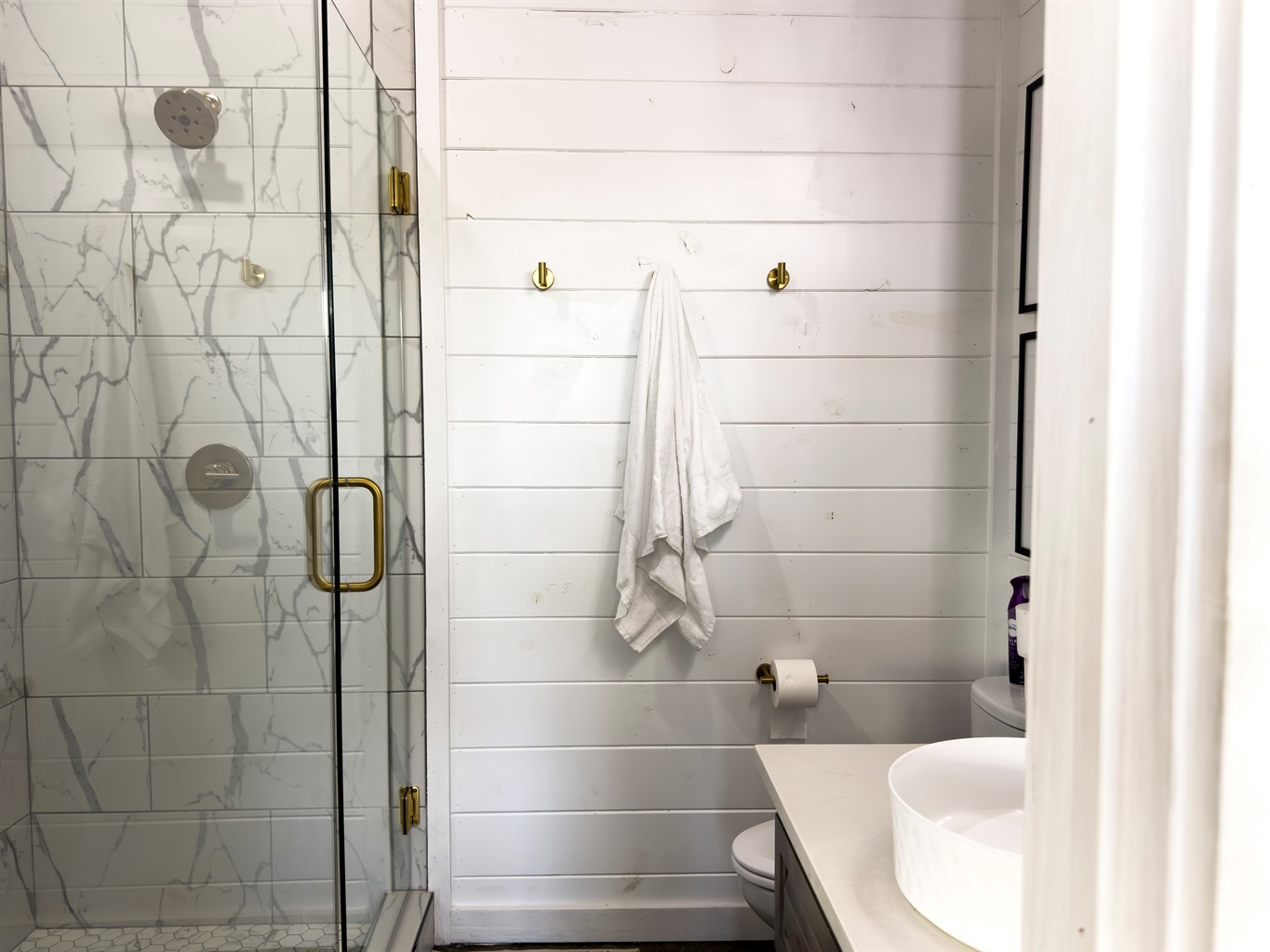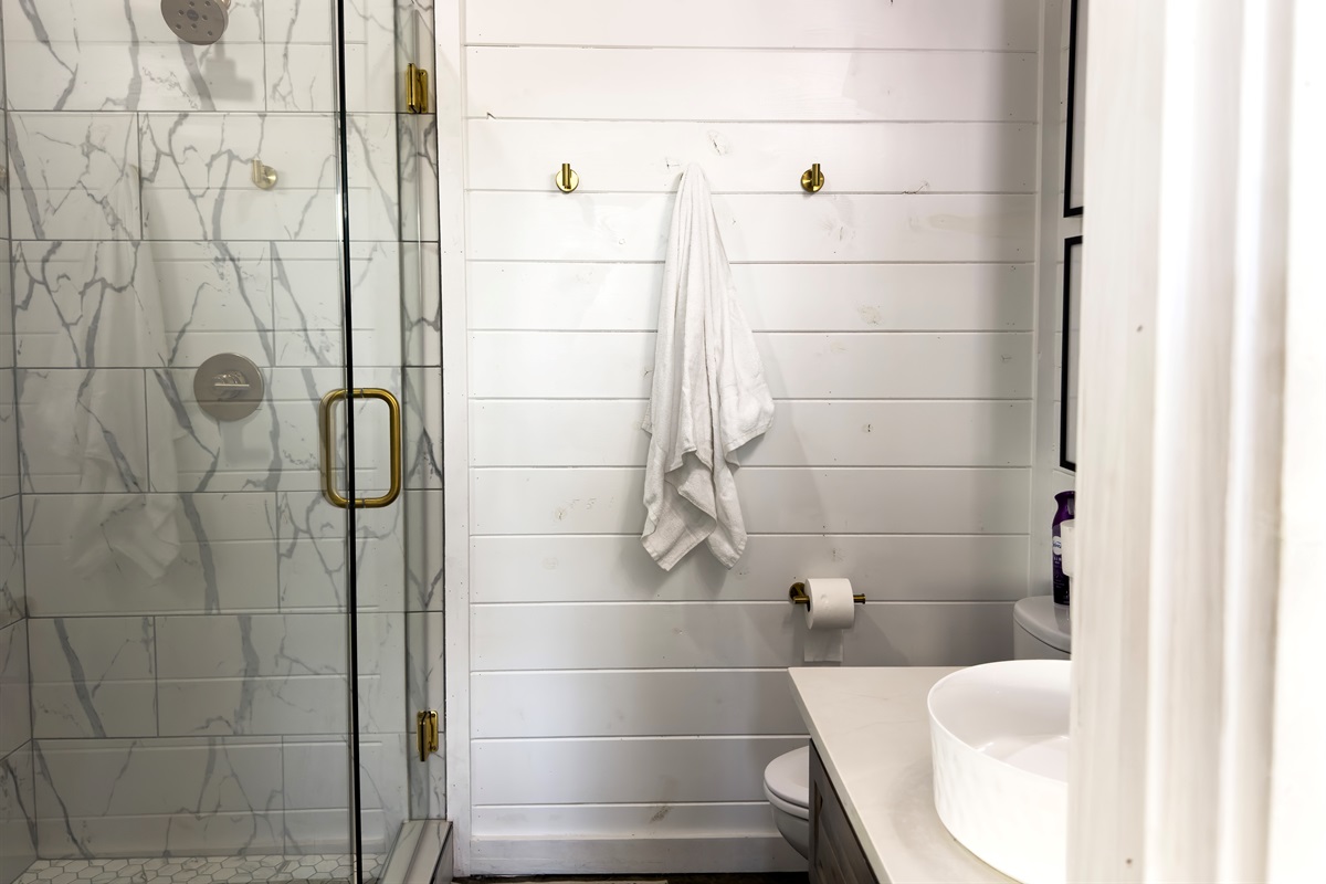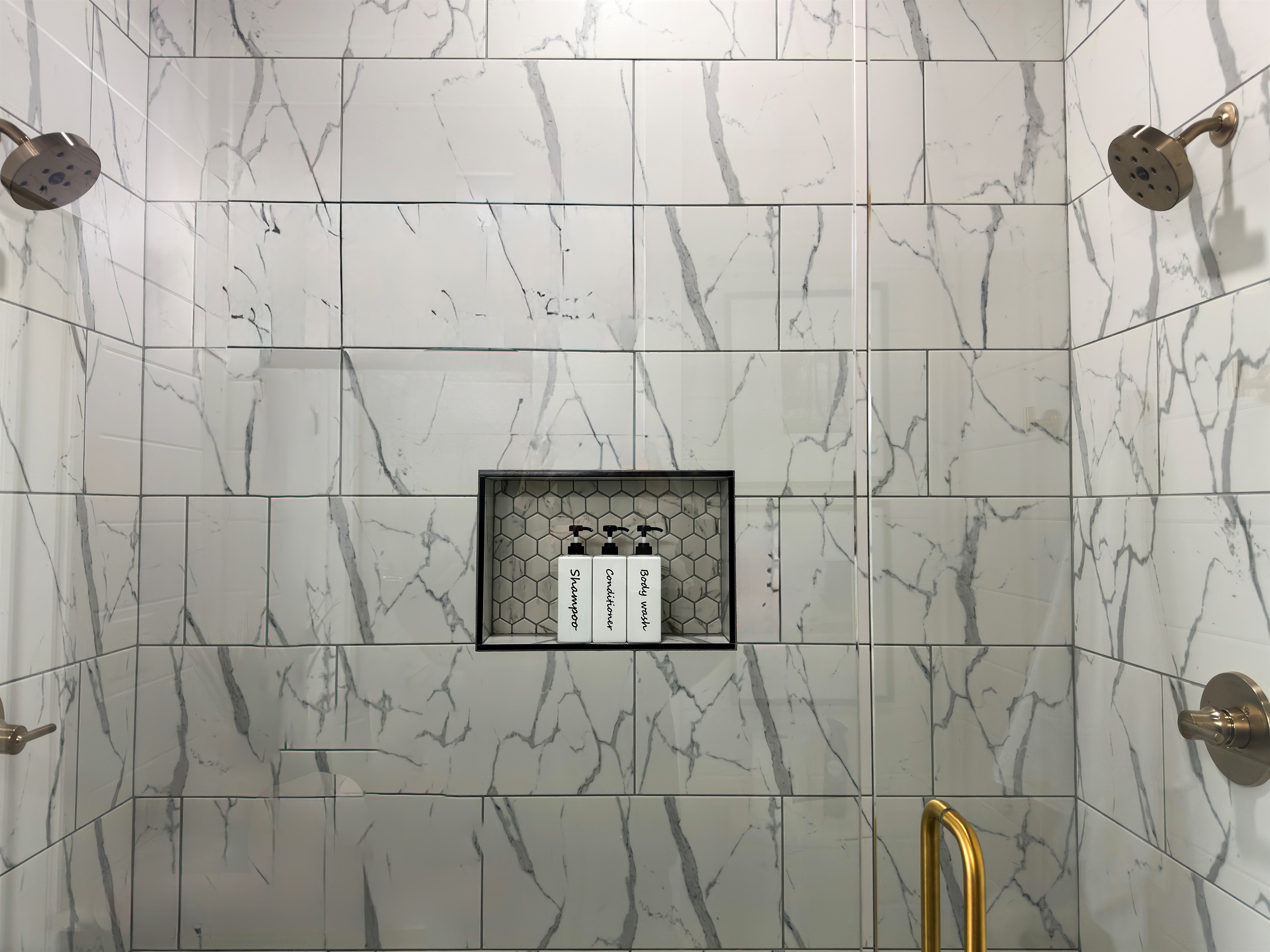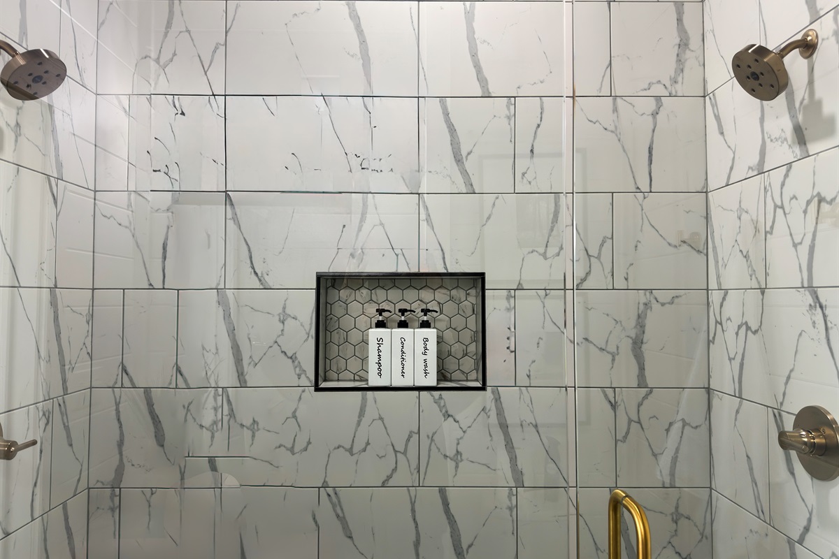 Single vanity with mirror Dual showerhead, standing shower (no tub) Hair dryer Trash can Bath mat/rug Shampoo, conditioner, body wash, hand soap, toilet paper provided |