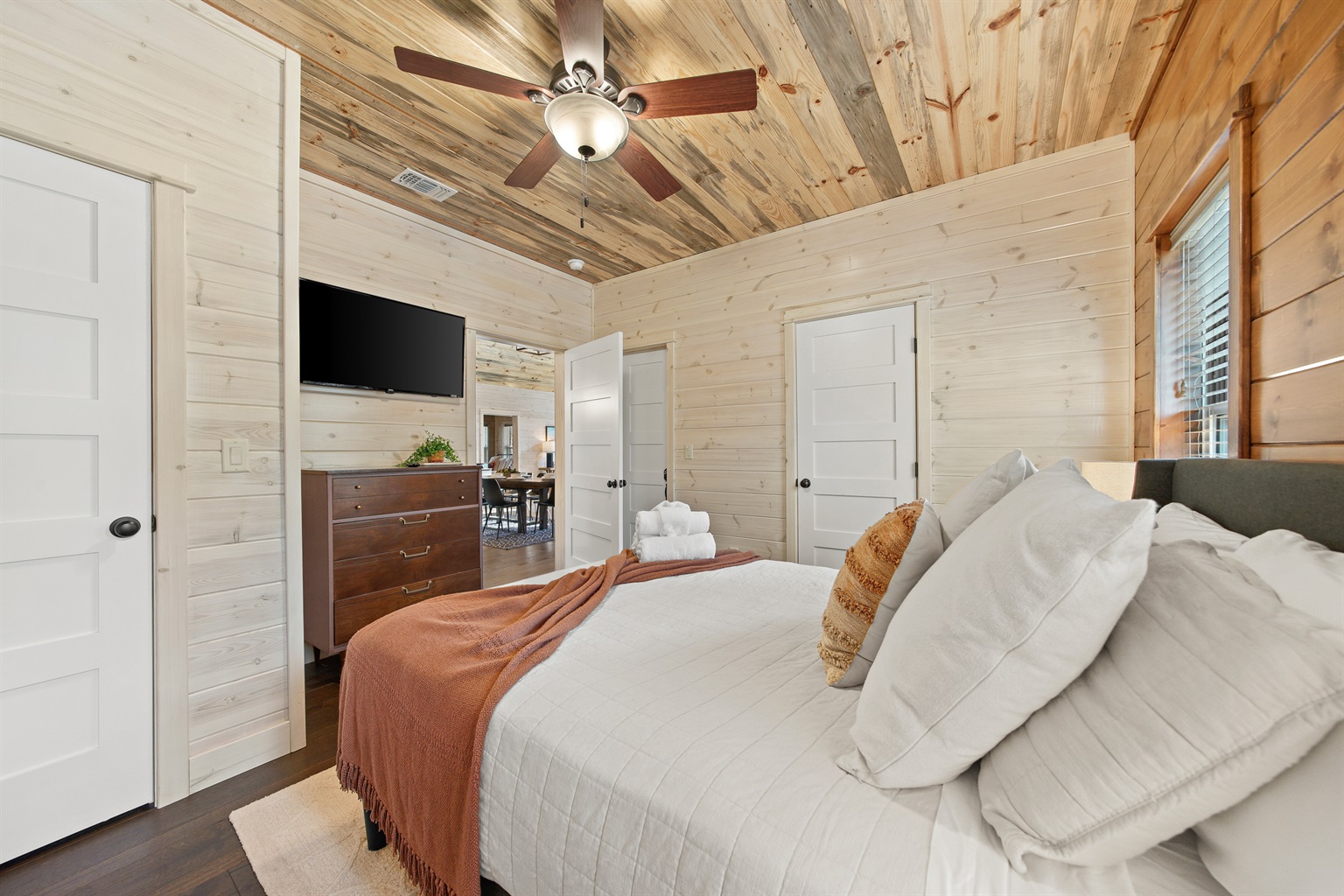 In Queen Bedroom 2, you’ll find a queen bed, bedside tables with lamps, and ceiling fan. Watch TV in bed on the large smart TV. Storage is available in the dresser.
