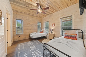 The final bedroom similarly offers a pair of twin beds, TV, and storage in the form of a closet.
