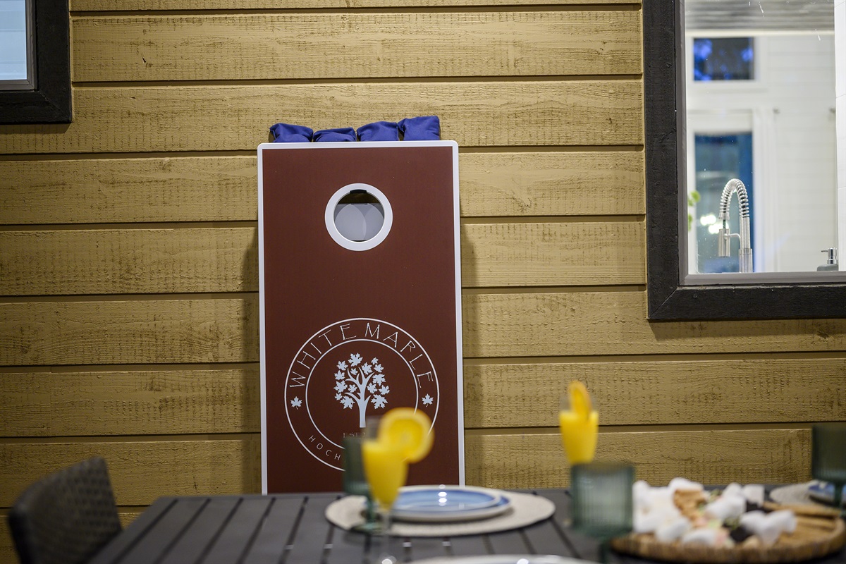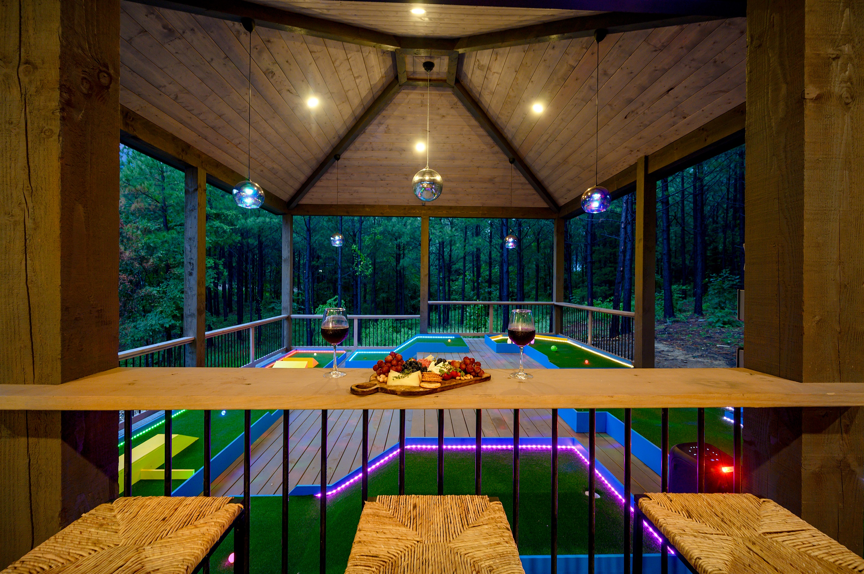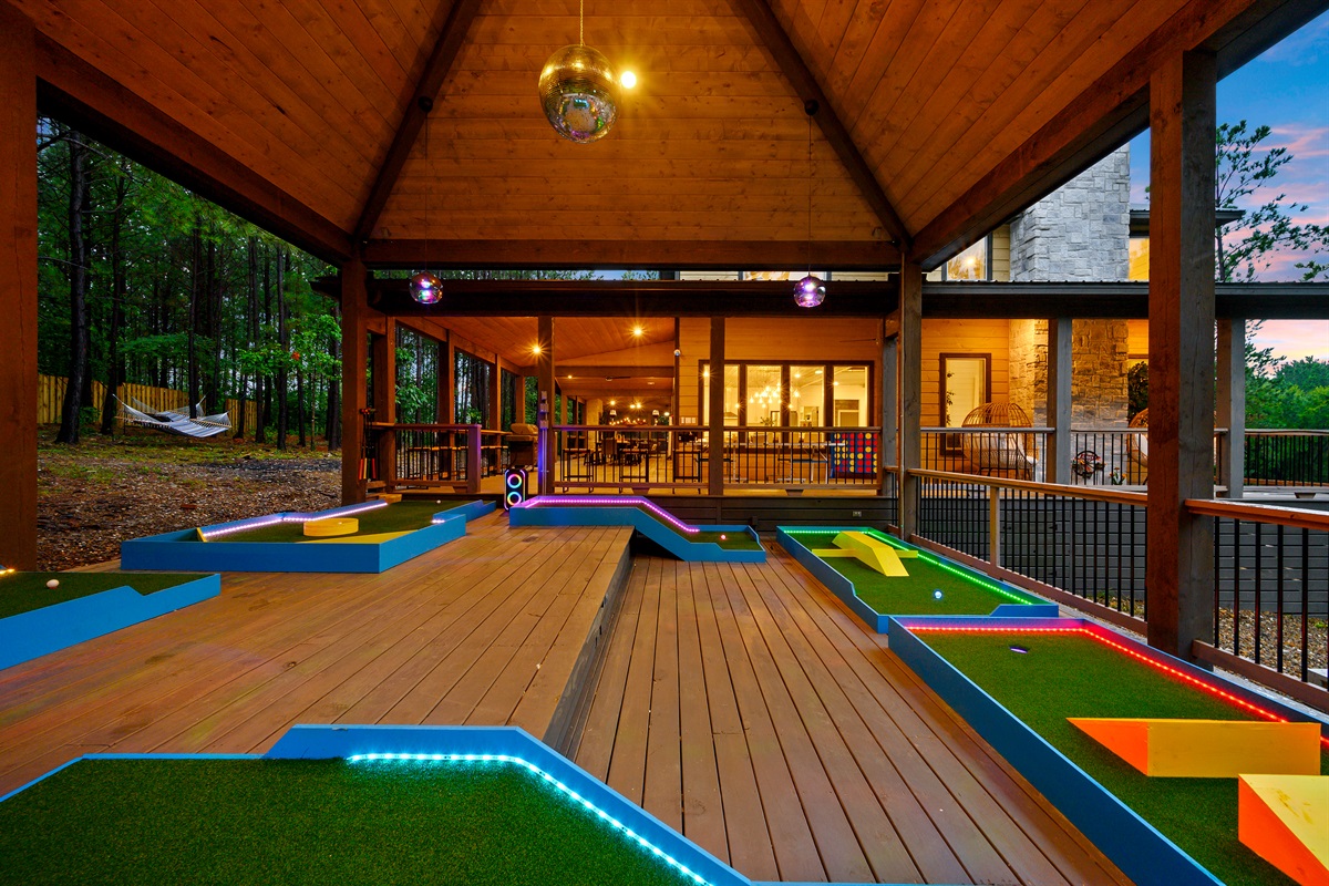 Head outside to explore the outdoor amenities, including the pergola, where you’ll have a blast playing 5-hole obstacle Glow Putt Putt with party-ambiance lighting with a Disco Ball, LED neon lights on the Course, and a glow Bluetooth speaker to set the fun to music, taking you day to nighttime fun!