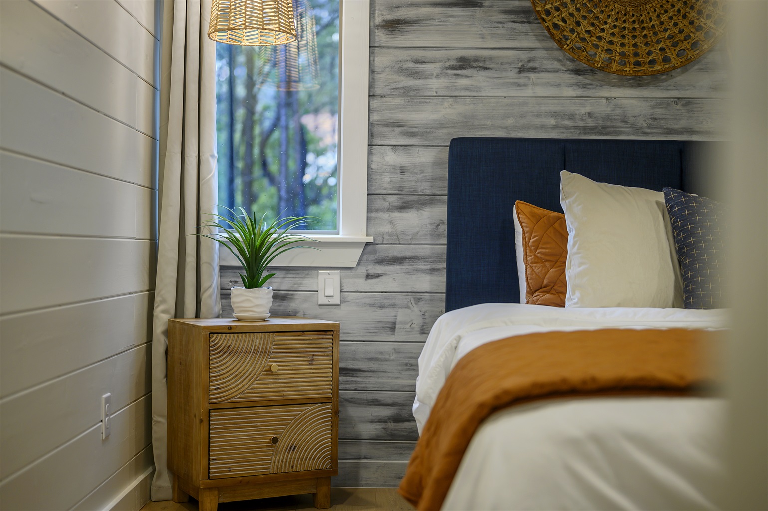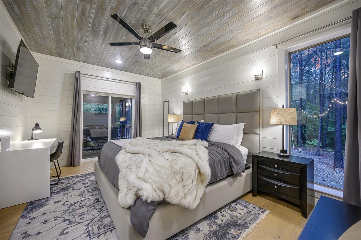 Also available to choose is the Gray Bedroom with direct access via sliders to the covered deck. Watch the 55” smart TV and rest comfortably in the king bed with sumptuous linens. You’ll have huge windows, a ceiling fan, closet, and bedside tables with drawers and lamps. Should you need to do remote work, you’ll find a workspace with desk and chair in this room. Enjoy the convenient ensuite bathroom with shower and all bathroom essentials.