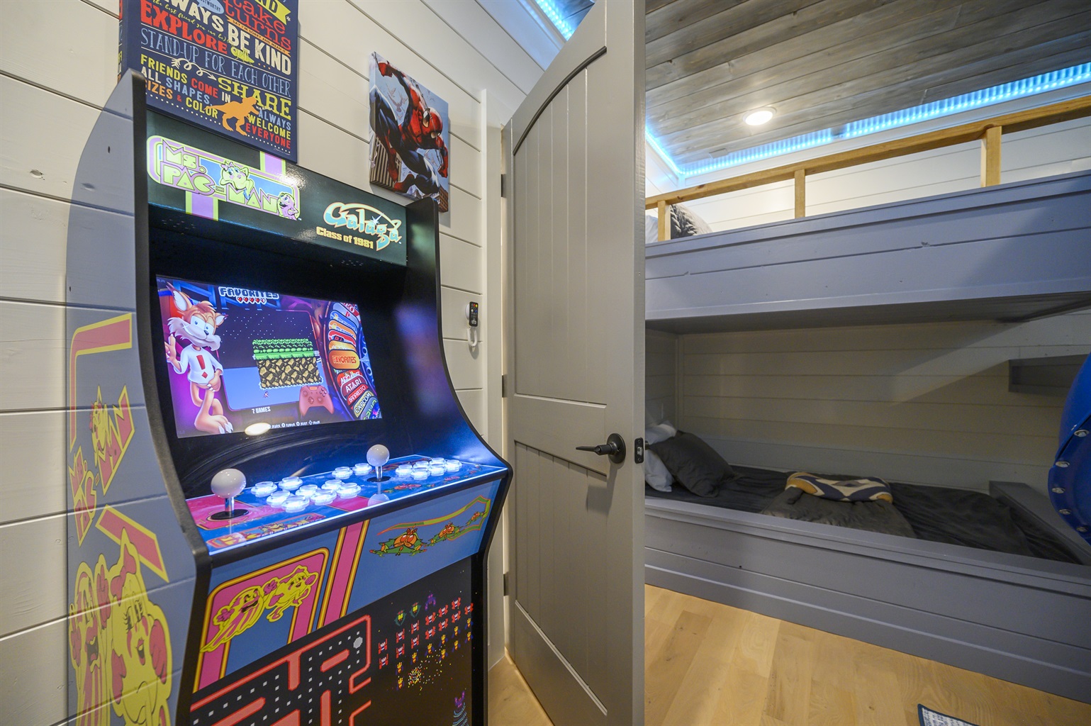 The kiddos will go nuts over the Downstairs Bunkroom with slide. They can slide from the upper-bunk level to the lower or play games on the arcade console when they’re not in their bunks – a 2-level full-on-full bunk bed and a 3-level full-on-full-on-full bunk bed. A luggage rack provides storage, and you’ll find seating here, too.