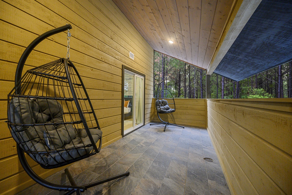 Relax on chair swings on the upstairs balcony, accessed through the Boho King Bedroom and Blue King Bedroom.