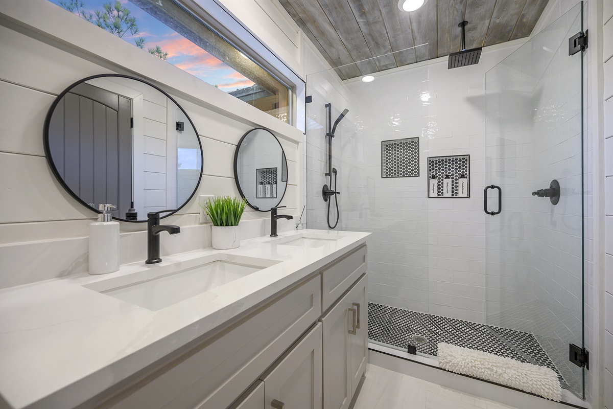 Last but not least is the upstairs Blue King Bedroom with king bed, 55" smart TV, and access to the balcony. You’ll have a closet, additional storage, and workplace with desk and chair. Refresh in the ensuite bathroom with standing shower.
