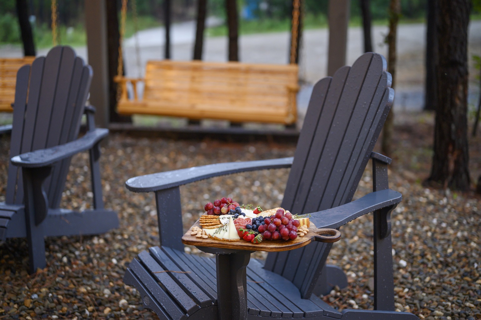 Beyond the deck, stretch out on hammocks. Gather the group for fun times in the firepit area, kids and adults can enjoy custom swings while making smores or roasting hot dogs while laughing, sharing stories, and making memories under festive string lights. Turn the kiddos loose on the super-fun outdoor kids’ playset.